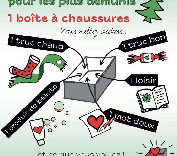 Pour remplir vos « boîtes à chaussures », il vous faut : un truc chaud, un truc bon, un divertissement, un produit d’hygiène ou de beauté neuf et un mot doux ou un beau dessin réalisé par vos enfants à l’occasion des fêtes de Noël.