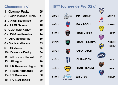 On vous le promet, on ne fera pas de mauvaise blague cette fois-ci. Et on espère du plus profond de notre cœur que les Agenais n’en feront pas sur le terrain non plus. Il s’agit en effet de confirmer la bonne forme actuelle. Avec deux victoires et un match nul, les coéquipiers de Vincent Farré signent leur meilleure série de la saison mais aussi depuis plusieurs saisons. Dans un championnat aussi serré, la répercussion sur le classement se ressent directement. Grâce à leur succès obtenu très chèrement à Narbonne, les Agenais sont désormais douzièmes de Pro D2. Le tableau reste à nuancer puisque Bourg-en-Bresse, premier relégable, reste quatre points derrière. Bernard Goutta, le nouveau manager, a aussi martelé son souhait de regarder devant. L’optimisme permet donc de voir que Carcassonne, septième et donc dans la première moitié de tableau, n’est qu’à six points. Un écart infime alors qu’il reste encore treize matchs à disputer.