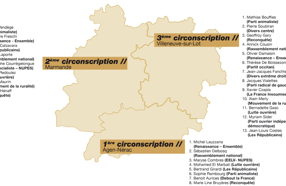 Le premier tour des élections législatives approche à grands pas, et les professions de foi sont toutes arrivées, à peu de chose près, dans les boîtes aux lettres des électeurs. Le moment est venu pour chacun de prendre connaissance de l’ensemble des candidats inscrits sur sa circonscription, avant de se présenter dans les bureaux de vote ce dimanche 12 juin. Un scrutin de grande importance, puisqu’il aura logiquement un fort impact sur la politique qui sera menée pour les cinq prochaines années, selon la majorité qui ressortira des 577 députés désignés par les citoyens. Depuis la réélection d’Emmanuel Macron en avril dernier, les partis se sont mis en ordre de marche avec cette échéance en ligne de mire. En Lot-et-Garonne, les premiers candidats se sont fait connaître rapidement, arpentant les marchés et autres évènements publics à la rencontre des habitants. Sur les trois circonscriptions, les députés sortants, Michel Lauzzana, Alexandre Freschi et Olivier Damaisin, sont repartis en campagne pour briguer un nouveau mandat, sous l’étiquette Renaissance, parti de la majorité présidentielle (qui prendra officiellement la place de La République en Marche en juillet prochain). Cependant, après les résultats de l’élection présidentielle et le score record obtenu par Marine Le Pen et le Rassemblement national, avec 41,45% des suffrages sur tout le pays, rien n’est joué. Pour rappel, la candidate est arrivée en tête des votes au premier comme au second tour dans le département, creusant l’écart de près de 8 000 voix avec le président la République au premier tour, et 1 600 au second. Cette dernière a déclaré le 5 juin dernier, lors d’un rassemblement dans le Pas-de-Calais dans son fief d’Hénin-Beaumont « vouloir vaincre la malédiction », et obtenir davantage de sièges au sein de l’Assemblée nationale. Les trois candidats investis par le parti bleu marine n’en sont pas moins déterminés et souhaitent aller « chercher ces voix » qui feront la différence.