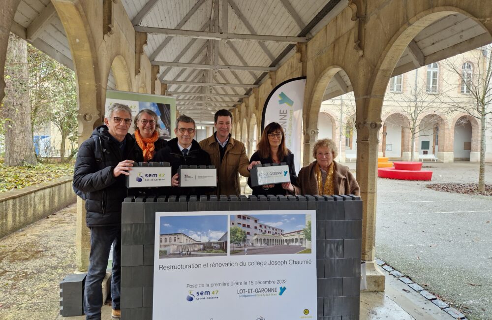 Voilà le plus gros morceau du « plan collèges » initié par le Conseil départemental de Lot-et-Garonne en 2019. Pour rappel, cette action, développée sur la totalité du 47, prévoit la rénovation des établissements du département, de manière à favoriser l’éducation locale. A Agen, la longue histoire du collège Joseph Chaumié continue de s’écrire aujourd’hui avec la pose de la première pierre des travaux de rénovation. D’un montant de 12,5M€, ce chantier constitue l’opération financière et technique la plus importante du projet départemental. Qualifiés « d’opération de dentelle » par les architectes, ces travaux ont démarré durant l’été 2022 avec l’aménagement de huit modulaires qui permettent d’assurer, depuis la rentrée, la continuité pédagogique. Une fois de plus, un important effort est réalisé pour minimiser l’impact énergétique des futures infrastructures, avec un objectif de diminution de 40% de la consommation. La production énergétique par voie photovoltaïque est actuellement étudiée.