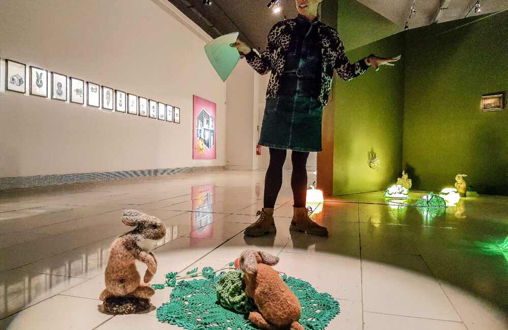 « J’ai beaucoup rencontré d’enfants, explique l’artiste. J’aime voir leurs réactions face à l’art. » Si Mélanie Maura a beaucoup exercé en deux dimensions, c’est une œuvre en trois dimensions, réinterprétant « Les Lapins » de James Leygues, qui pourrait faire son petit effet auprès du jeune public. « J’adore ce tableau, affirme-t-elle. Il est tellement modeste et mignon. J’ai voulu tendre une perche pour sortir ces petits lapins du cadre. » Ils sont plusieurs à être mis en scène, à même le sol, avec des feuilles de chou décorées grâce à des passoires. « Tous les animaux ont été tricotés à la main grâce à une technique très méditative. » Une autre œuvre en 3D fait écho à un tableau bien plus connu, celui du « Goûter sur l’herbe » de Réalier-Dumas. On voit ainsi une nappe envahie par la mousse prenant la forme d’un jardin à la française. Derrière, l’idée de la destruction-créatrice. Assurément, une exposition qui détonne et qui vaut le détour. Mélanie Maura assurera des ateliers d’arts plastiques durant le mois de février mais aussi des visites commentées pour les groupes adultes et scolaires, sur réservation.