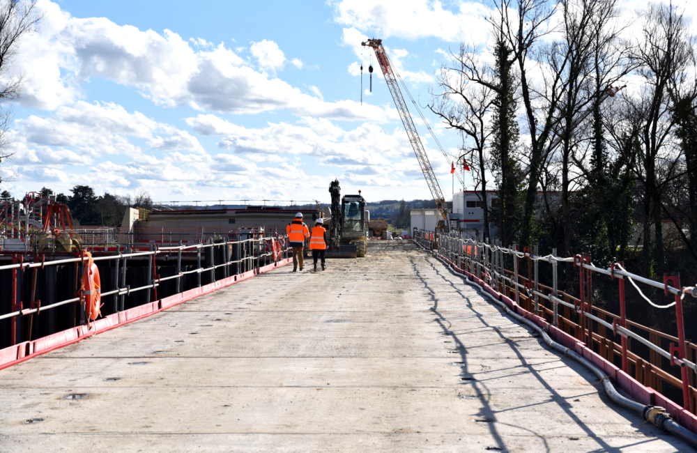 Démarré au 1er juillet 2022, l’énorme chantier suit relativement bien son cours. Ce vendredi 24 février, à l’occasion de la visite du chantier, Denis Audouard, chef de projet au sein de l’Agglomération, a pu faire un point aux élus sur l’avancement concret des travaux. Pour le moment, 50 % des ouvrages de décharges (chargés de gérer l’eau lors des crues) sont réalisés, les appuis des deux ponts ont été réalisés à 25% et 92% des livraisons d’acier ont été assurés, tandis que les convois exceptionnels commencent désormais à emmener les imposantes parties de la charpente métallique.
