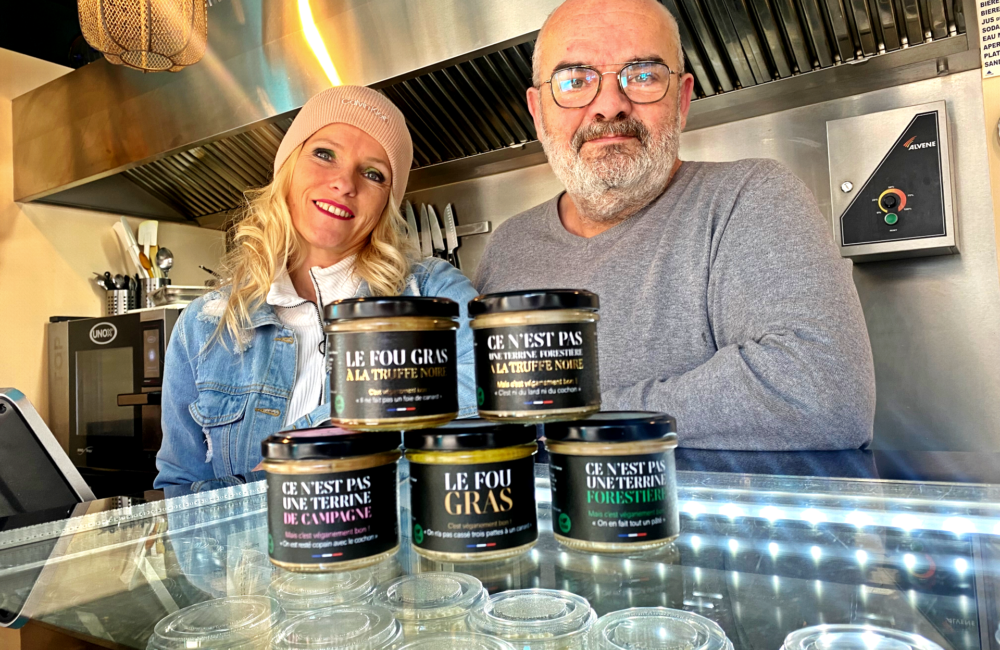 La promesse d’un beau (et bon) mensonge. Des petits pots en verre, visuellement bluffants si on ne regarde pas la petite mention « vegan » sur l’étiquette. Un « grand bluff », accompli par l’ancien chef étoilé lot-et-garonnais Fabrice Biasiolo en compagnie de sa fille Ninon. Celui qui, auparavant, était à la tête de l’Auberge en Gascogne et de Canard, cochon et compagnie, a décidé de ne pas casser trois pattes au palmipède et de rester copain avec le mammifère.