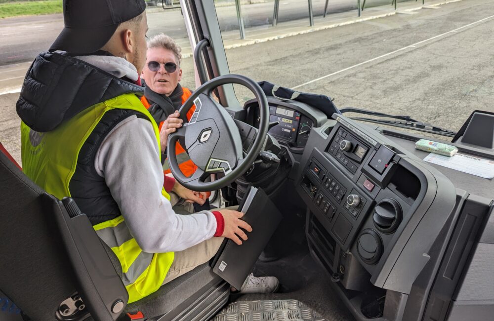 Sur le plateau du M.I.N., au cœur d’un groupe de huit élèves, Ludovic, 54 ans, parfait son apprentissage du métier de conducteur routier. Âgé de 54 ans, ce retraité de la gendarmerie souhaite s’offrir une seconde carrière. « J’ai toujours aimé être sur la route, ce sentiment de liberté et d’autonomie. Comme je ne voulais pas rester inactif, je me suis tourné vers cette formation qui me permet d’associer travail et plaisir. Cela faisait un moment que ça me titillait et ce je vois pour l’instant me conforte dans ce choix. Et puis je sais qu’il y aura du boulot à la sortie », décrit Ludovic, dont la formation a été financée à 100% grâce à l’accompagnement de France Travail (ex-Pôle Emploi).