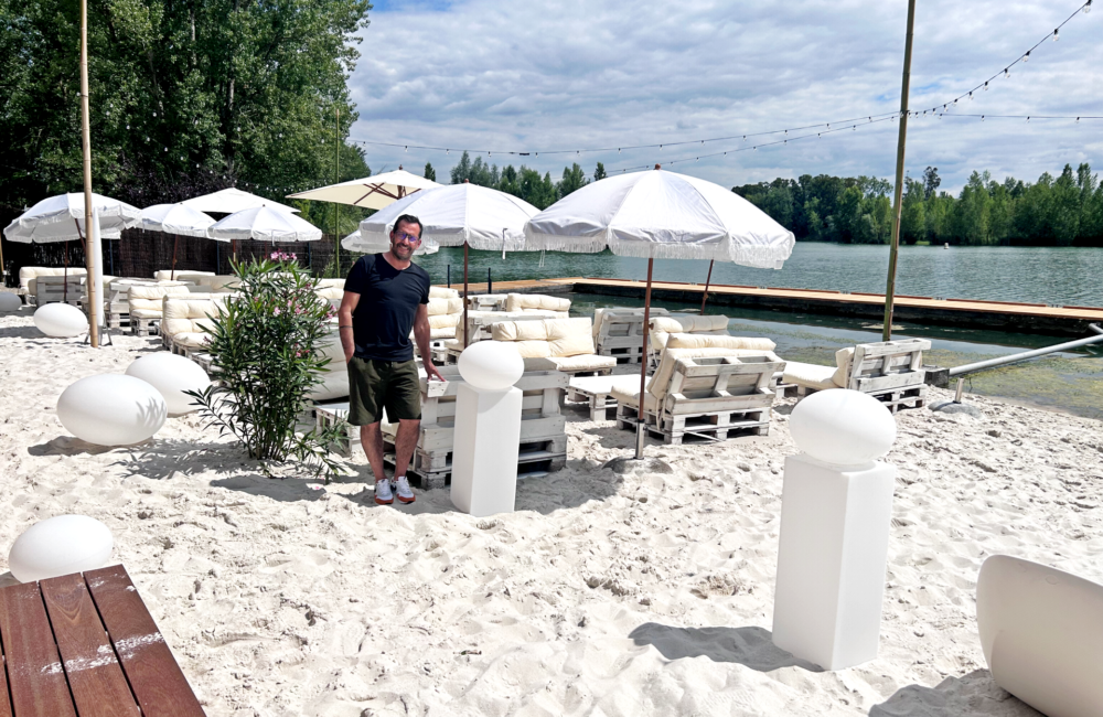 On doit la renaissance de ce lieu à Anthony et Jérôme Delbos, associés à Matthieu Berthoux et Pierre François. « On a voulu faire quelque chose qui plaise à tout le monde », explique ce dernier. « Nous avons plusieurs espaces différents pour des envies différentes : une petite plage avec canapés et tables basses pour ceux qui aiment se prélasser au bord de l’eau, une terrasse en bois qui surplombe le bar pour ceux qui préfèrent un cadre plus posé pour manger, une zone appelée la pergola que nous louons déjà pour des groupes, et un espace dans l’herbe avec des mange-debouts. Et bien sûr, il y a aussi l’espace comptoir pour les irréductibles des soirées debout au bar. »
