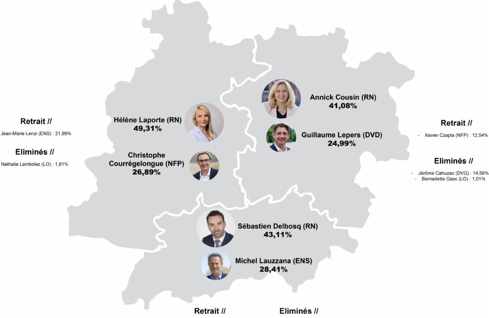 Malgré tout, ces additions et petits calculs ne doivent pas réduire l’ampleur des scores réalisés par Hélène Laporte, Annick Cousin et Sébastien Delbosq, tous trois à plus de 41%. Toutes les dernières élections confirment leur montée en puissance. Et surtout, les représentants du RN gagnent systématiquement des voix entre deux tours. En 2022, année qui en a vu deux sur trois accéder au Palais Bourbon, la progression était significative. Sébastien Delbosq et Hélène Laporte étaient passés d’un peu plus de 12 000 voix à respectivement 19 000 voix et 16 500… Mention spéciale à Annick Cousin qui avait quant à elle quasiment doublé ses voix (9600 à près de 19 000). Et ce malgré une baisse de la participation dans deux circonscriptions. Si un tel scénario se répète, même à moindre échelle, c’est la victoire assurée. Le rejet de la politique d’Emmanuel Macron et l’état délabré du parti Les Républicains sont aussi des boulets accrochés aux pieds de Michel Lauzzana et Guillaume Lepers qui pourraient peser lourd dimanche prochain. Enfin, les appels à voter « pour faire barrage » sont un classique qui ne paie plus autant qu’avant.