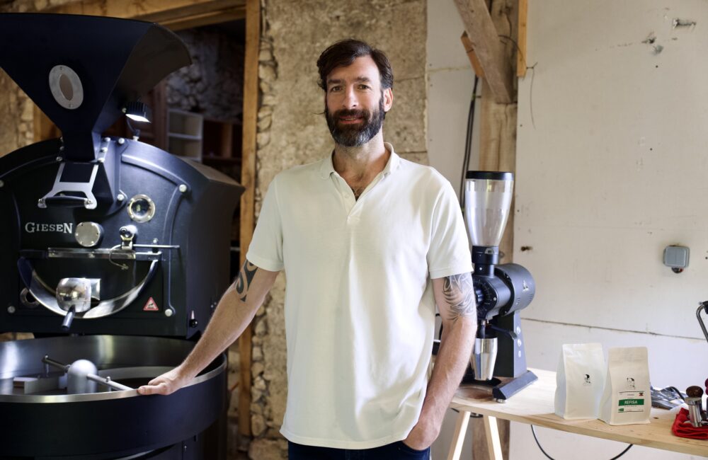 Aujourd’hui, j’ai mon entreprise de production de café avec ma femme Jeanny. Je suis donc torréfacteur et barista. Cela fait cinq ans que Racine Coffee existe, mais en réalité, mon amour du café ne date pas d’hier. Le café, c’est à la fois très simple et en même temps tellement vaste. Je pourrais en parler pendant des heures ! C’était d’abord une passion durant ma carrière, et c’est devenu un projet concret quand on a fondé notre entreprise de café de spécialité bio. Nous avons d’abord ouvert un atelier de torréfaction artisanal et une boutique dans le bassin lémanique à Douvaine, en Haute-Savoie, ainsi qu’un coffee truck. Plus récemment, nous sommes revenus vivre en Lot-et-Garonne. Il y a un petit côté « retour aux sources » qui est symbolique aussi.