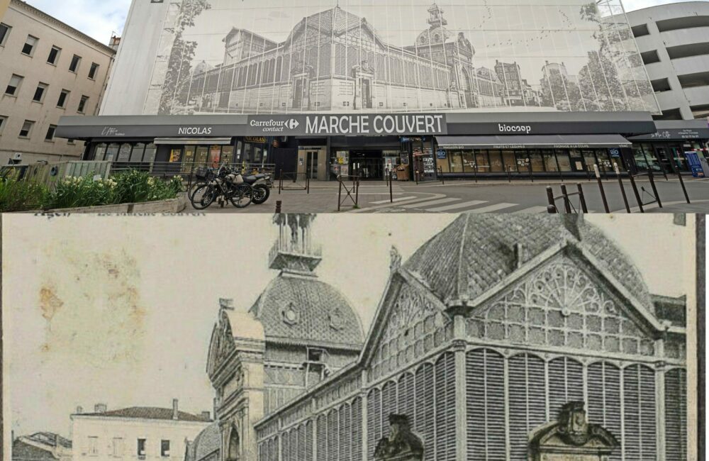 Le « Grand Marché » de la place Jean-Baptiste Durand, conçu par l’architecte Lhéritier en 1884, devint rapidement un lieu central de la vie agenaise. Inspiré des Halles Baltard à Paris, ce marché était un véritable symbole de modernité pour la ville. Avec ses 180 étals et son campanile de 26 mètres de hauteur, il incarnait l’eff ervescence de la ville. Ce marché était bien plus qu’un simple lieu de commerce ; il était le cœur de la ville.