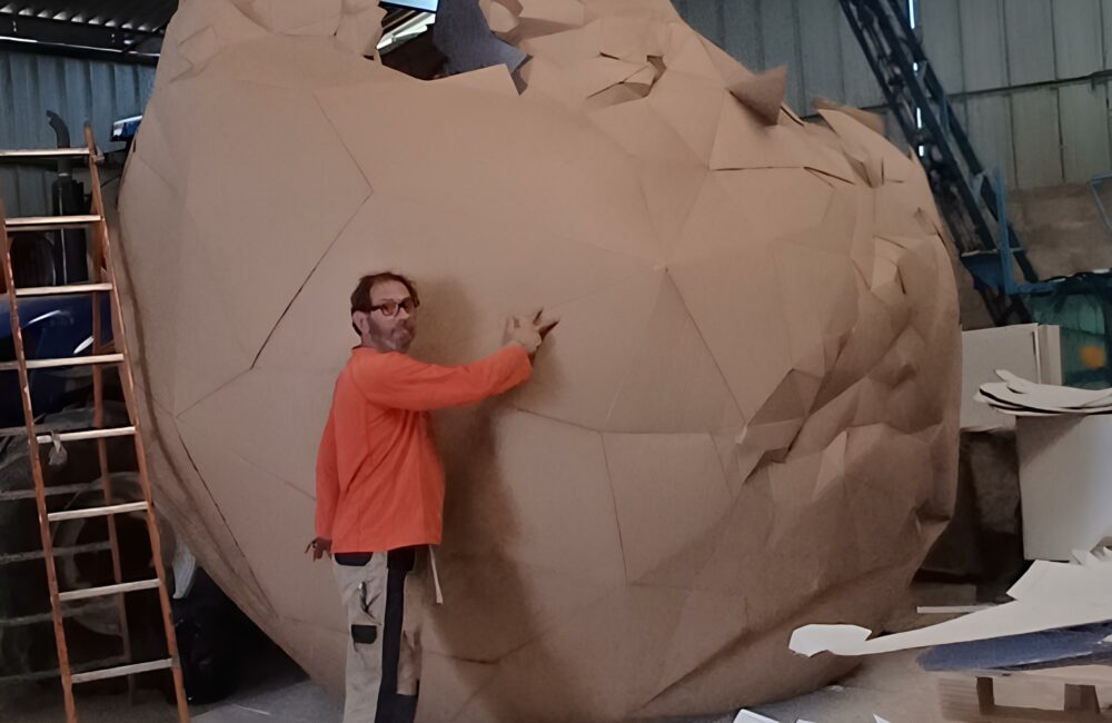 « Je travaille le carton depuis 17 ans. Et depuis 7 ans, professionnellement je ne fais plus que ça. » Loin d’un simple bricolage, Stéphane Munoz dont l’atelier est situé dans le Lot, revendique un processus rigoureux, entamé par la modélisation 3D, poursuivi par une découpe vectorielle, et achevé à la main. Le passage entre le numérique et le geste artisanal donne naissance à des sculptures de plusieurs mètres de haut, montées, pliées, assemblées à partir de couches de carton croisées. Certaines de ses œuvres peuvent atteindre huit mètres. Leur apparente fragilité contraste avec leur gabarit massif. Les œuvres seront implantées dans le centre-ville, à même les espaces de circulation piétonne. En s’appuyant sur le réseau des commerçants d’Agen qui ont fourni la matière première le projet inscrit l’art dans une logique de circuit court.
