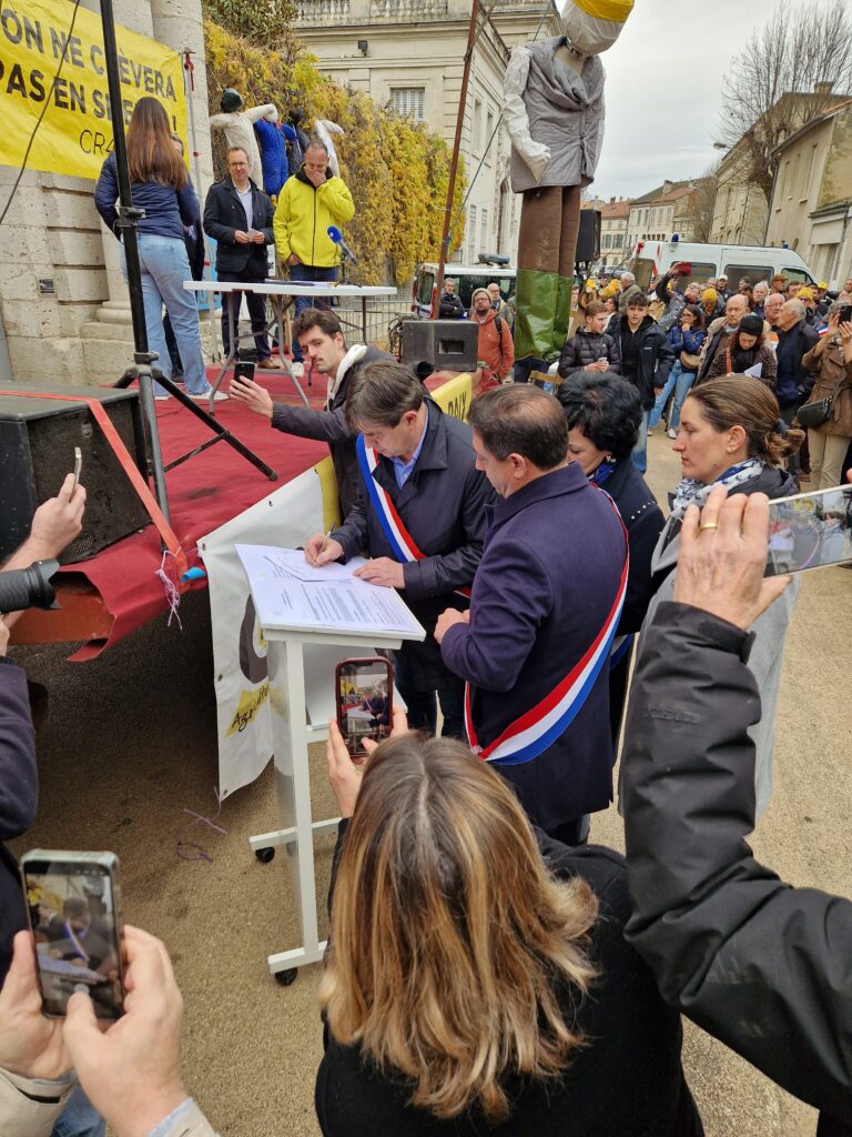La colère du monde agricole s’exprime une nouvelle fois, ce vendredi 19 décembre, place Armand-Fallières à Agen. À l’appel de la Coordination rurale de Lot-et-Garonne (CR 47), plus de 400 personnes manifestent pour alerter sur la crise de la dermatose nodulaire contagieuse (DNC) et sur ce qu’ils considèrent comme « une asphyxie réglementaire du secteur. » Des dizaines de mannequins pendus aux grilles et aux arbres symbolisent la détresse des exploitants, déjà éprouvés par l’abattage de cheptels et l’incertitude économique. Autour des agriculteurs, maires, sénateurs députés et élus répondent à l’appel. Tous étaient invités à signer un moratoire destiné à « sauver l’agriculture française », un document qui doit être transmis à Matignon.