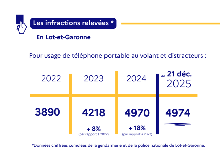 Le Lot-et-Garonne s’engage dans un durcissement de la lutte contre l’usage du téléphone au volant. Constatant une accidentalité marquée par l’ « inattention et l’usage des distracteurs technologiques », la préfecture annonce la possibilité de suspendre administrativement le permis de conduire pour les conducteurs contrôlés smartphone en main, même en l’absence d’autre infraction. Cette décision s’appuie sur une tendance nationale inquiétante. En 2024, un défaut d’attention a été relevé dans près d’un quart des accidents corporels en France, causant la mort de 419 personnes. Les contrôles routiers montrent également une hausse continue des verbalisations pour usage du téléphone au volant.