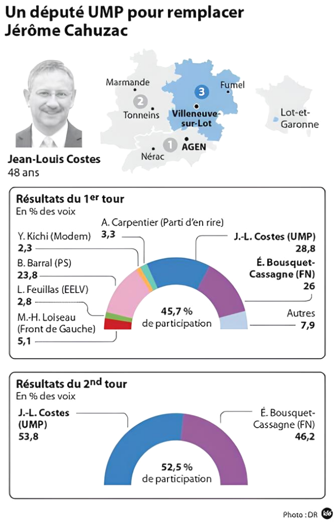 En juin 2013, la 3ᵉ circonscription du Lot-et-Garonne se retrouve une fois de plus au centre de l’attention nationale après la démission du député et ancien ministre du Budget Jérôme Cahuzac, emporté par le scandale de son compte bancaire dissimulé à l’étranger. La législative partielle organisée pour lui trouver un successeur attire une profusion inhabituelle de candidatures : pas moins de 17 prétendants briguent le siège, transformant la campagne en véritable « barnum » politique dans le Villeneuvois. Face au candidat UMP Jean-Louis Costes et au socialiste Bernard Barral, de nombreuses listes issues de formations diverses ou de candidatures atypiques se lancent dans la bataille, tandis que le Front national espère capitaliser sur la défiance née de l’affaire. Soutenu par Marine Le Pen, le jeune candidat Étienne Bousquet-Cassagne crée la surprise en se qualifiant pour le second tour. Le PS, lui, est éliminé dès le premier tour, symbole d’un scrutin marqué par la désillusion de l’électorat qui n’avait plus confiance en le parti de la majorité présidentielle. Au terme du duel final, Jean-Louis Costes l’emporte avec un peu plus de 53 % des voix.