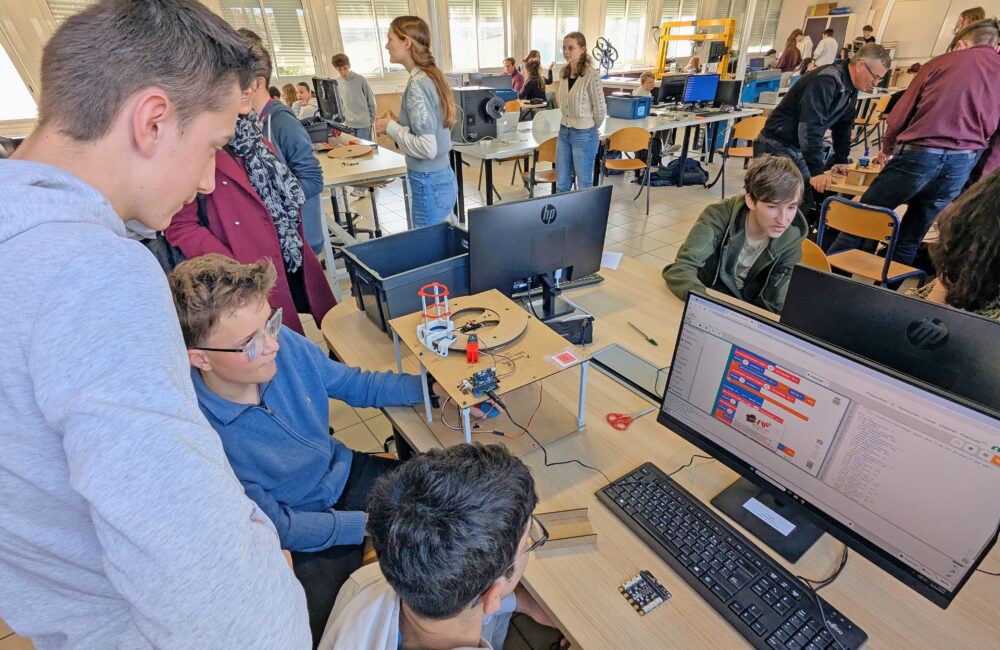 Concevoir un robot industriel à même pas 15 ans et en l’espace de deux jours seulement ? Oui, c’est possible ! C’est d’ailleurs ce qu’ont fait 68 élèves issus de huit collèges lors des Journées de l’innovation au lycée Lot-et-Bastides les 29 et 30 mars. Si cette appellation fait penser à un évènement national, il n’en est rien. L’initiative est bel et bien partie d’un groupe d’enseignants très engagés de l’établissement villeneuvois, mené par Fabrice Sablier, professeur d’informatique et de sciences de l’ingénieur. Sur le principe du hackathon, ces deux journées avaient pour objectif de créer des conditions favorables pour l’exploration et le développement de projets innovants liés aux nouvelles technologies. « Chaque équipe partait avec une même mission. Cette année, il s’agissait de créer un outil automatisé capable de trier des bouchons en plastique par couleur. On leur donne le début de la machine. À eux de positionner le capteur de couleurs, de concevoir et programmer les systèmes de bacs séparatifs, de trouver le mouvement le plus pertinent (translation, rotation…), de lancer la fabrication des pièces », détaille Fabrice Sablier. Pour les aider dans cette tâche, les collégiens ont pu compter sur leurs professeurs de technologie, qui ont découvert le sujet en même temps qu’eux. Les équipes étaient complétées par des tuteurs de luxe, en l’occurrence des lycéens de 1ère et Terminale dans les sections STI2D, Sciences de l’ingénieur (SI) et Numérique et sciences informatiques (NSI). Le résultat final a ensuite été soumis à un jury composé d’enseignants, de chefs et cadres d’entreprise, d’un ingénieur retraité, d’un spécialiste de l’impression 3D… « Les jeunes ont non seulement montré leur machine mais ont aussi dû justifier leurs choix. Le défi est volontairement relevé avec un produit difficile à mettre en œuvre même si cela s’appuie sur des concepts et des logiciels avec lesquels ils sont déjà familiers », indique Fabrice Sablier.