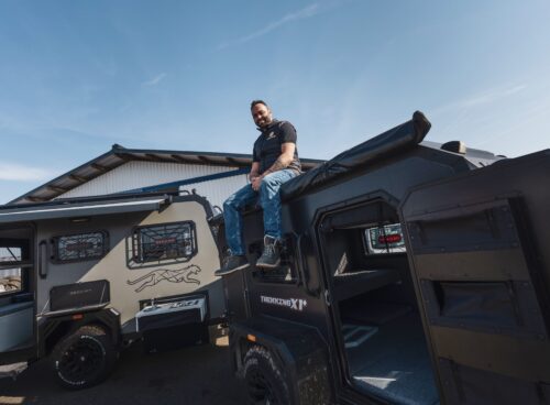 Sur le parking, plusieurs caravanes robustes et un fourgon 4×4 parfaitement aménagé trônent devant...
