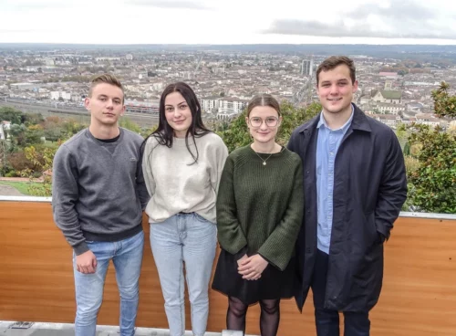 Enzo, Elisa, Charlotte et Julien représentent fièrement le BTS Professions Immobilières avec une vue...